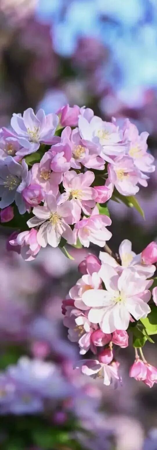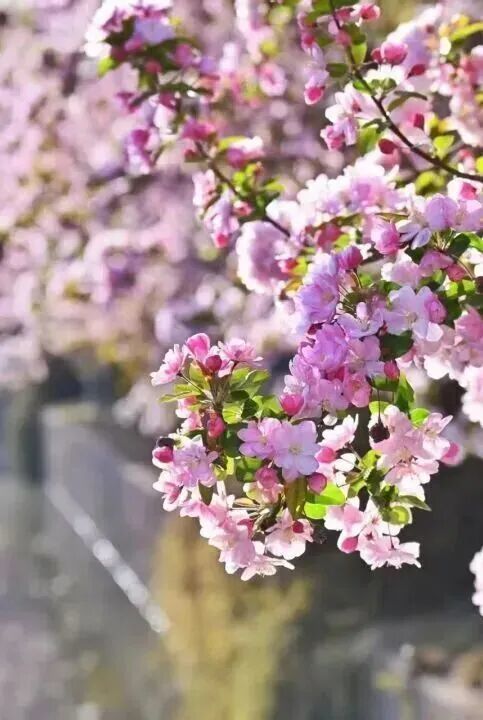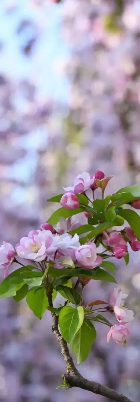 粉白、嫣红的花瓣缀满枝端