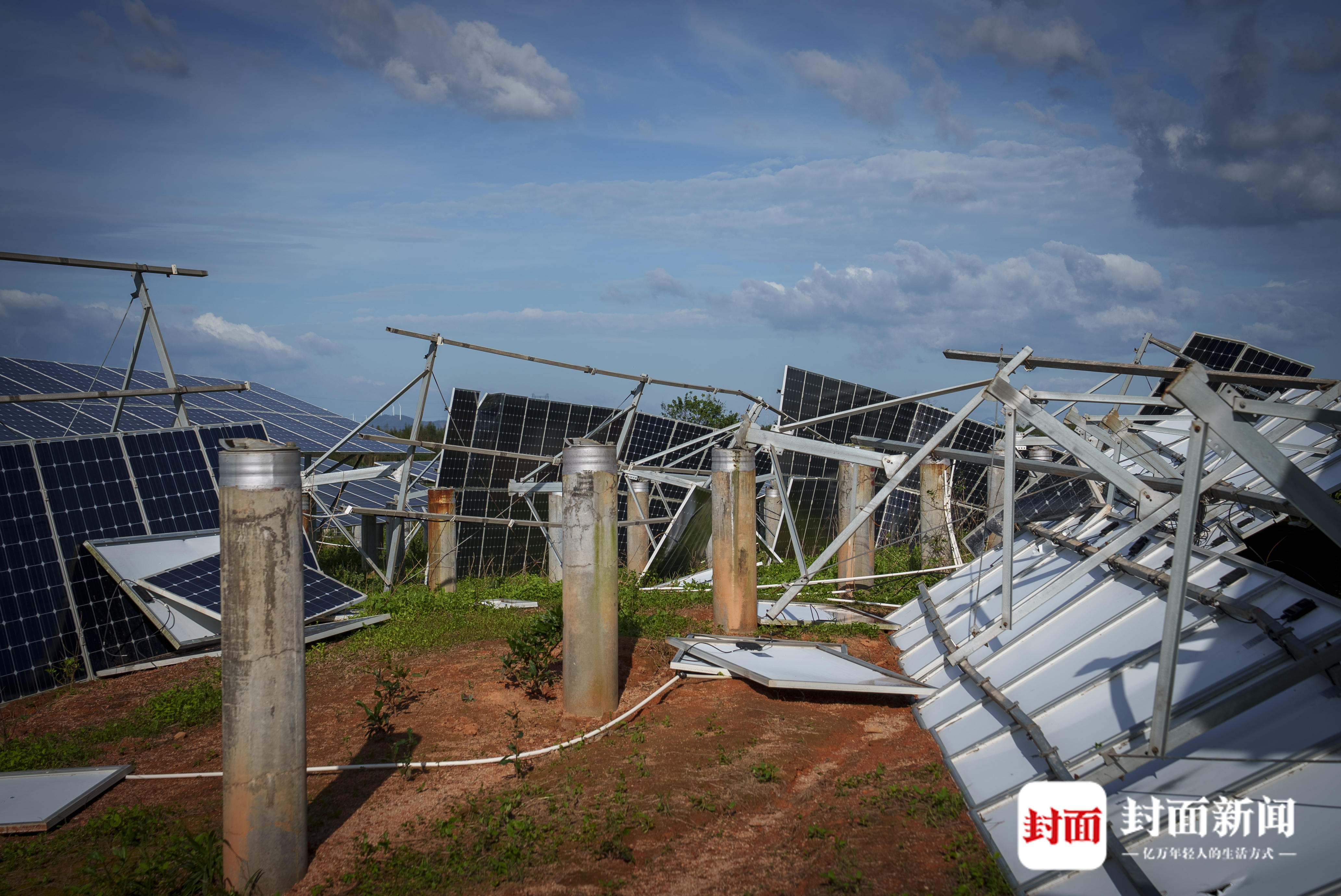除了风电场外,9月26日下昼,封面新闻记者在阳东区大沟镇鑫业光伏电站看到,占大地积1700亩的光伏发电池在强风雨中大片受损,许多发电池被吹卷变形,飞出铁网洒落一地,该电站2015年8月投产,遐想寿命25年,年发电量5700万度电。