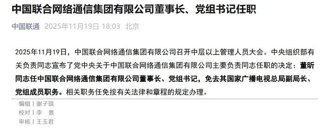 据中国联通公众号音信,2025年11月19日,中国纠合网罗通讯集团有限公司召开中层以上科罚东谈主员大会。中央组织部连系精良同道布告了党中央对于中国纠合网罗通讯集团有限公司主要精良同道任职的决定:董昕同道任中国纠合网罗通讯集团有限公司董事长、党组文书,免去其国度播送电视总局副局长、党构成员职务。连系职务任免按连系法律和规定的步调办理。