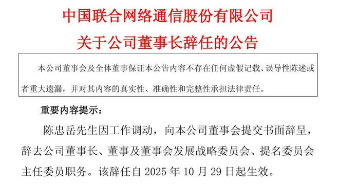 10月29日,中国联通公告,公司董事长陈忠岳因责任转换,肯求辞去公司董事长、董事等职务,该辞任自2025年10月29日起收效。陈忠岳辞任后将不再担任公司任何职务。