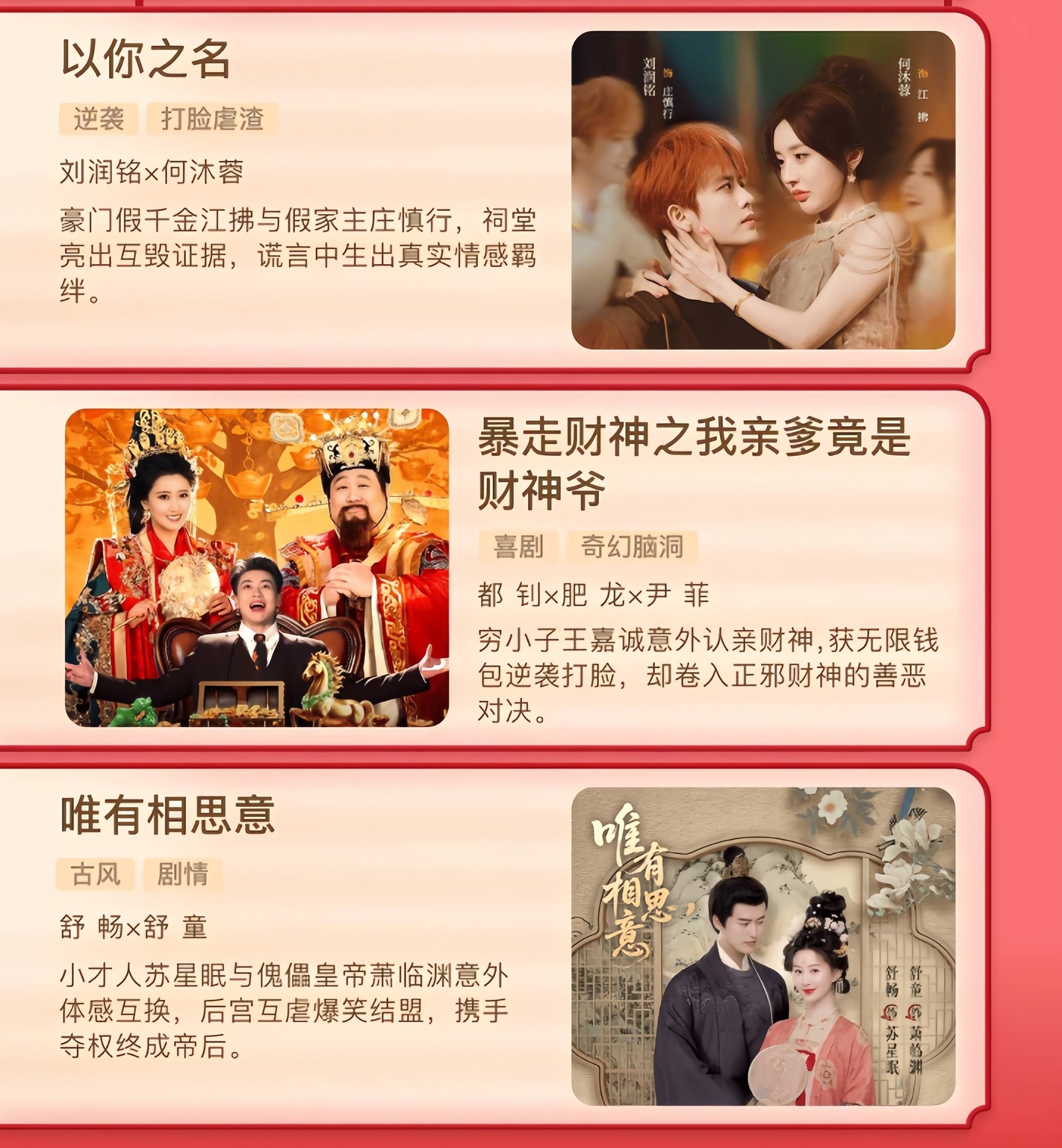 《只有相想意》爽快&舒童,爽快的前几部短剧口碑齐还可以,此次是古装穿越轻笑剧,还有男女主体感互换的剧情,应该挺好玩。