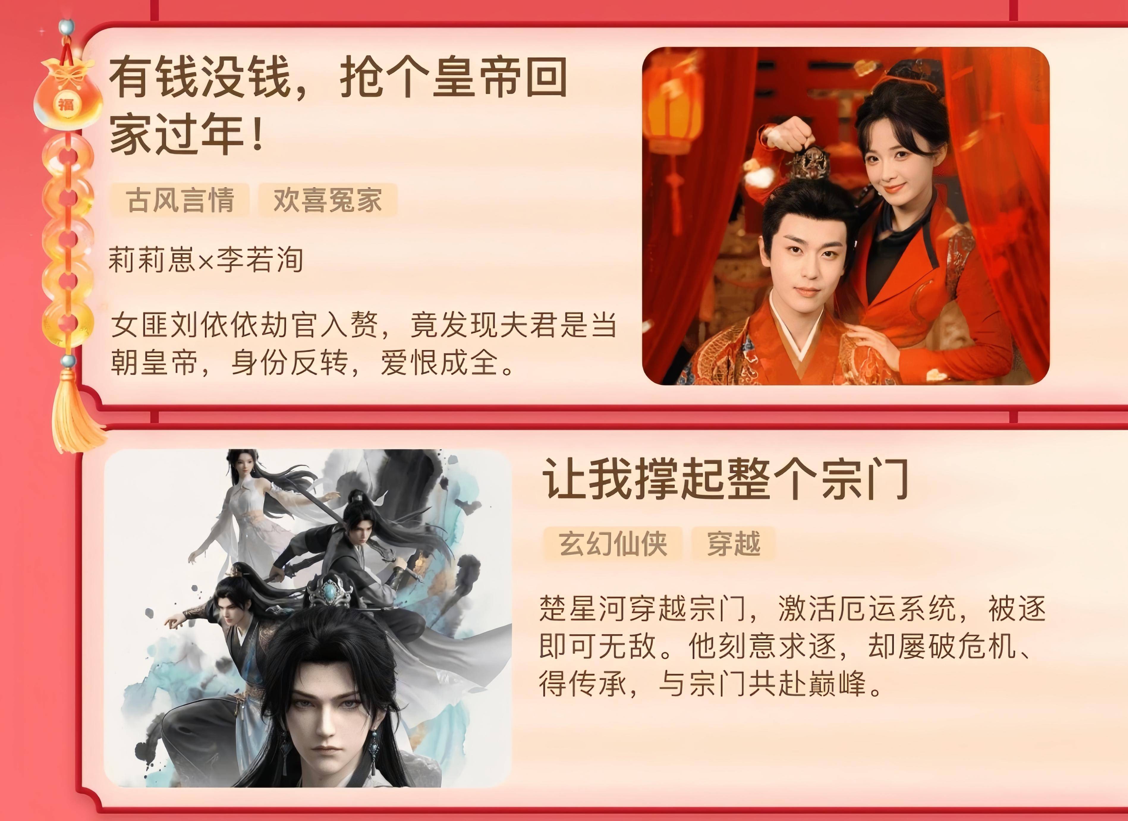 这一天基本齐是男频剧,李若洵和莉莉崽的《有钱没钱,抢个天子回家过年》是唯独一部女频了。