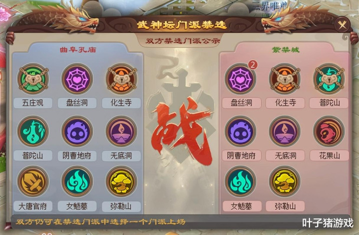在禁选依次中,紫禁城为迫使曲阜孔庙废弃多封系声势,遴选禁用化生寺与五庄不雅;而曲阜孔庙念念路明确,为适度敌手使用四保一声势,则禁掉了紫禁城的普陀山和化生寺。最终,紫禁城回生了普陀山,曲阜孔庙则回生了化生寺。