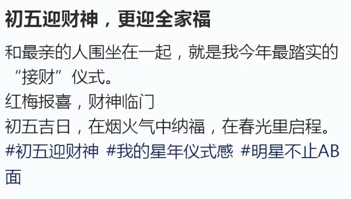 大岁首五这天原来就很容易被东谈主拿去作念著述,迎财神,开工,发红包,摆供品,拍个合影发个一又友圈,谁都能把典礼感摆出来,但陈数此次走的门路很豪迈,她径直晒了一张一家七口的全家福,然后留住一句很实在的话。