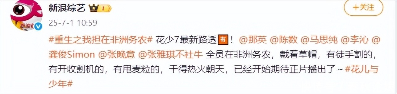 参考辛苦:【1】新浪综艺微博 2025-7-1 10:59 #更生之我担在非洲务农#