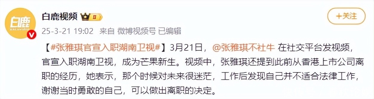 【2】白鹿视频微博 2025-3-21 19:02 #张雅琪官宣入职湖南卫视#