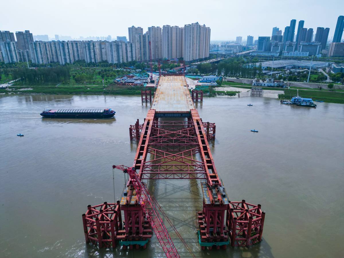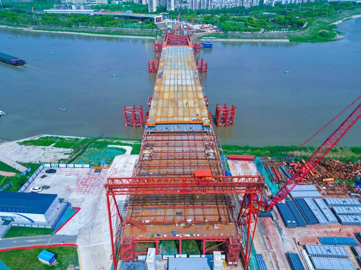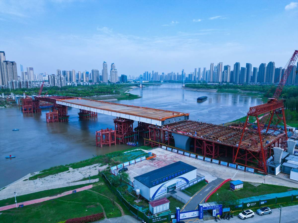 江汉十桥是武汉市盘算的第10座跨汉江通谈,亦然一座钢拱桥,主桥以钢质杆件组合而成,主桥用钢约1.7万吨。主跨380米,其中钢箱梁遴选循序式顶推法施工,最大顶推跨径达120米,顶推限度位各国内第二。该桥遴选“先梁后拱”施工工艺,中交二航局名目时代团队遴选智能应力监测系统,对临时墩千里降、钢箱梁线形进行毫米级精度适度,确保结构受力平衡。