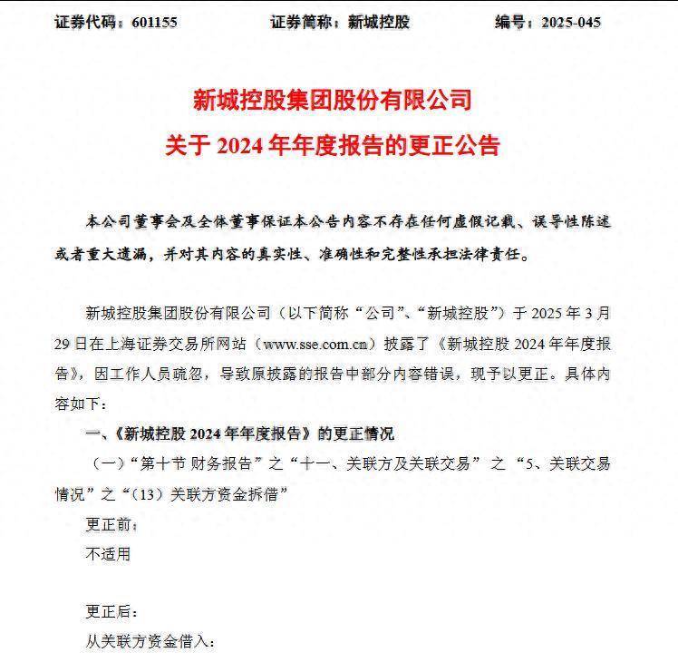 在《新城控股2024年年度文书》“第十节财务文书”之“十一、关连方及关连贸易”之“5、关连贸易情况”之“(13)关连方资金拆借”部分,原文书标注为“不适用”,现修订为:从关连方新城悦办事集团有限公司资金借入51.7亿元东谈主民币,同期文书期内偿还关连方资金51.7亿元东谈主民币。