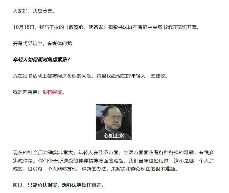 莫言称,10月18日,有媒体问莫言:年青东谈主怎样面对畏缩殷切?莫言回报:莫得提议。