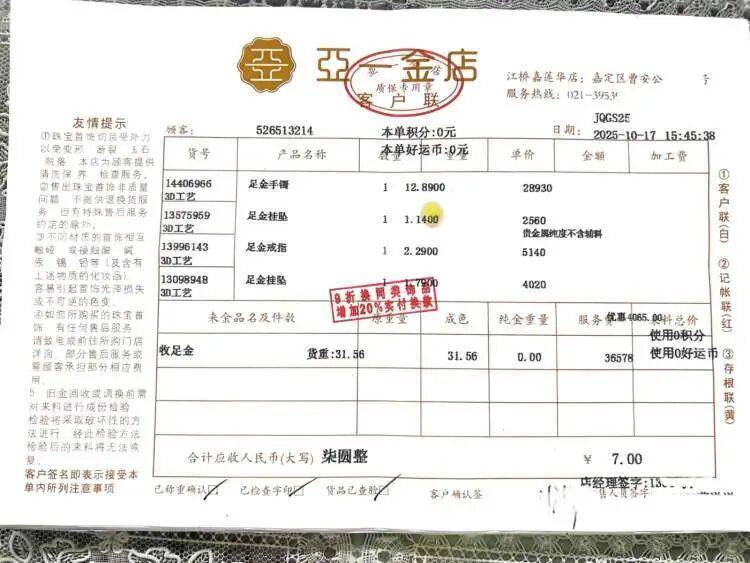 选好项目后,因为惊悸接孩子,钱女士录用母亲完成接下来的往返,我方急遽离开了亚一金店。钱女士的母亲在伴计的携带下,逐个在每张收条上署名。根据当日金价,钱女士的46.96克黄金共抵货款54426元。此外,在伴计的要求下,钱女士的母亲还补付了差价300余元。