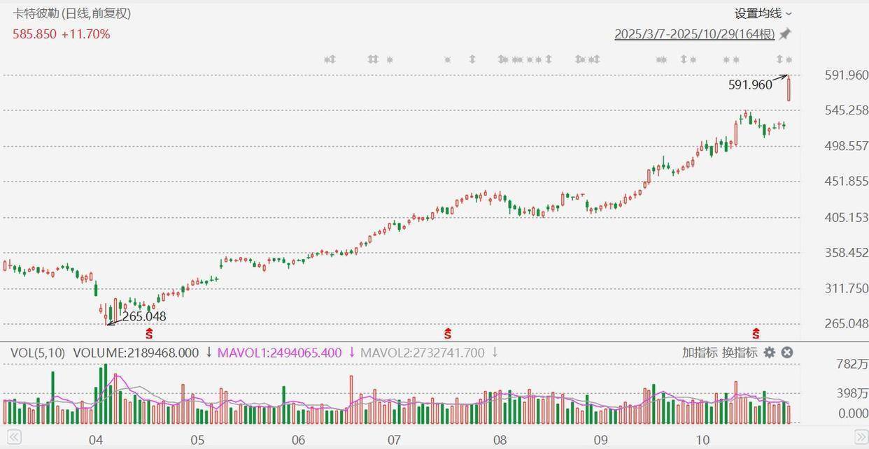 卡特彼勒盘中一度涨近13%,为2009年以来最大涨幅,报591.96好意思元开云体育(中国)官方网站,股价创历史新高,市值超2700亿好意思元。卡特彼勒公司第三季度调理后每股收益4.95好意思元,上年同时5.17好意思元,预估4.51好意思元;营收176.4亿好意思元,同比增长9.5%,预估167.1亿好意思元。机械、动力与交通业务营收167.3亿好意思元,同比增长9.8%。